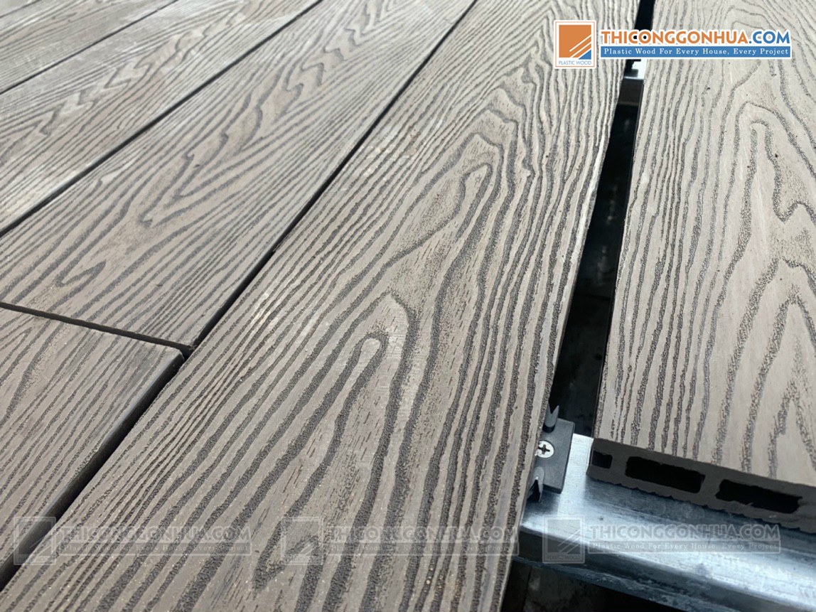 Sàn gỗ ngoài trời 3D vân nổi EW-3D03 : Sàn gỗ nhựa ngoài trời 3D bề mặt ngoại cùng được phủ màng PVDF. Sàn ngoài trời Ecowood được sản xuất với công nghệ tiến tiến nhất hiện nay trong ngày gỗ nhựa composite của Nhật Bản, có các nhà máy quy mô lớn tại Nhật Bản, Trung Quốc, Malaysia, Indonesia, Thái Lan. Sàn gỗ nhựa ngoài trời Ecowood được cấu tạo bởi 60% bột gỗ rừng nguyên sinh, 30% hạt nhựa pvc và 10% phụ gia an toàn lấp đầy bề mặt liên kết giữa gỗ và nhựa làm tăng khả năng liên kết đồng nhất chất liệu. Với công nghệ về vật liệu tiên tiến nhất của nhật bản hiện nay, sản phẩm sàn gỗ nhựa ngoài trời thương hiệu Ecowood đã sở hữu được bề mặt tốt nhất cho việc chống bám bẩn và nâng cao khả năng giữ màu, chống bạc màu do sử dụng và vượt trội hơn hẳn các sản phẩm gỗ nhựa thông thường, được nhà máy kiểm định chất liệu chặt chẽ theo tiêu chuẩn quốc tế cho vật liệu dành cho ngoài trời. Sàn gỗ nhựa ngoài trời Ecowood mang lại vẻ đẹp của gỗ tự nhiên với bề mặt hoàn mỹ, sang trọng đồng thời có khả năng chịu lực , chống xước , chống rạn nứt bài mòn trên bề mặt. Sàn gỗ ngoài trời Ecowood là sự lựa chọn hoàn hảo để thiết kế sàn cho không gian ngoại thất, loại bỏ được nhược điểm mà gỗ tự nhiên gặp phải. Có độ bền cao khoảng 15 năm đến 20 năm khi thi công ngoài trời, sàn gỗ ngoài trời ứng dụng cho mọi loại công trình ngoại thất và phù hợp với điều kiện khí hậu ven biển, nắng nóng, mưa nhiều tại Việt Nam.